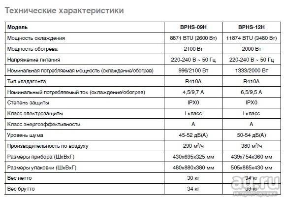 Приведем наиболее распространённые обозначения мощности кондиционеров в Британских Термических Единицах и их соответствия в кВт: