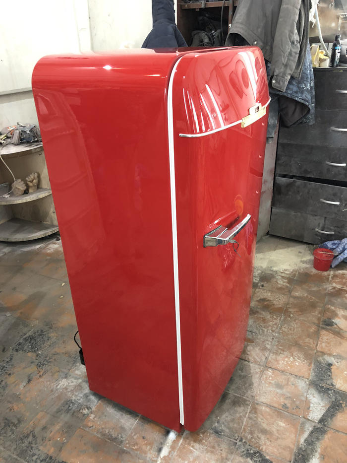 Для холодильников, когда отделка корпуса (внешняя оболочка) изначально представляет собой окрашенную поверхность, корпус и все связанные с ним панели подвергаются пескоструйной обработке для удаления не только многолетней грязи и мусора, но часто слоев и слоев краски там, где предмет может были окрашены в разные цвета. Очень часто можно встретить холодильники, окрашенные в самые актуальные декоративные цвета прошлых десятилетий (розовый или бирюзовый в 1950-х, зеленый авокадо в 1960-х и золотой или медно-коричневый в 1919-х).70-х). После того, как шкаф очищен до первоначальной металлической поверхности, мы начинаем ремонтные работы. Это включает в себя удаление вмятин, ремонт ржавых или коррозионных участков, а в худших случаях и изготовление новой панели или части прибора.