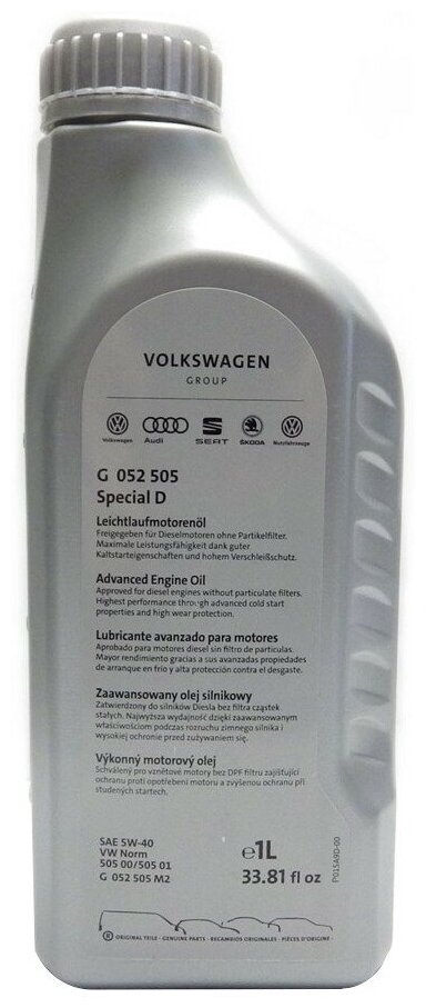 - Масла с низким содержанием SAPS, подходящие для двигателей Euro 4 и почти всех дизельных двигателей VAG, начиная с 2000 года, с увеличенными интервалами обслуживания, унитарных насосов-форсунок, а также двигателей Pumpe-Düse («PD»). За исключением двигателей V10, R5 и коммерческих автомобилей VW без установленного DPF (дизельного сажевого фильтра) – в них должно использоваться масло спецификации 506 01.