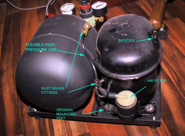 Сам двигатель установлен на пружинах, которые уменьшают вибрацию. Поскольку всасывание ведет непосредственно к сосуду компрессора, хорошо вставить пылевой фильтр перед всасыванием, чтобы он не загрязнял масло и не попадал в двигатель.