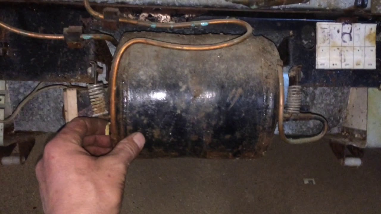 Компрессор холодильника всасывает прямо в металлический контейнер, в котором он все расположен и выдувается более тонкой трубкой, которая проходит от поршня. Внутри контейнера есть лужа специального компрессорного масла низкого давления, которое смазывает двигатель, а небольшое отверстие также попадает на поршень – время от времени выливается несколько капель масла из выпускной трубы.