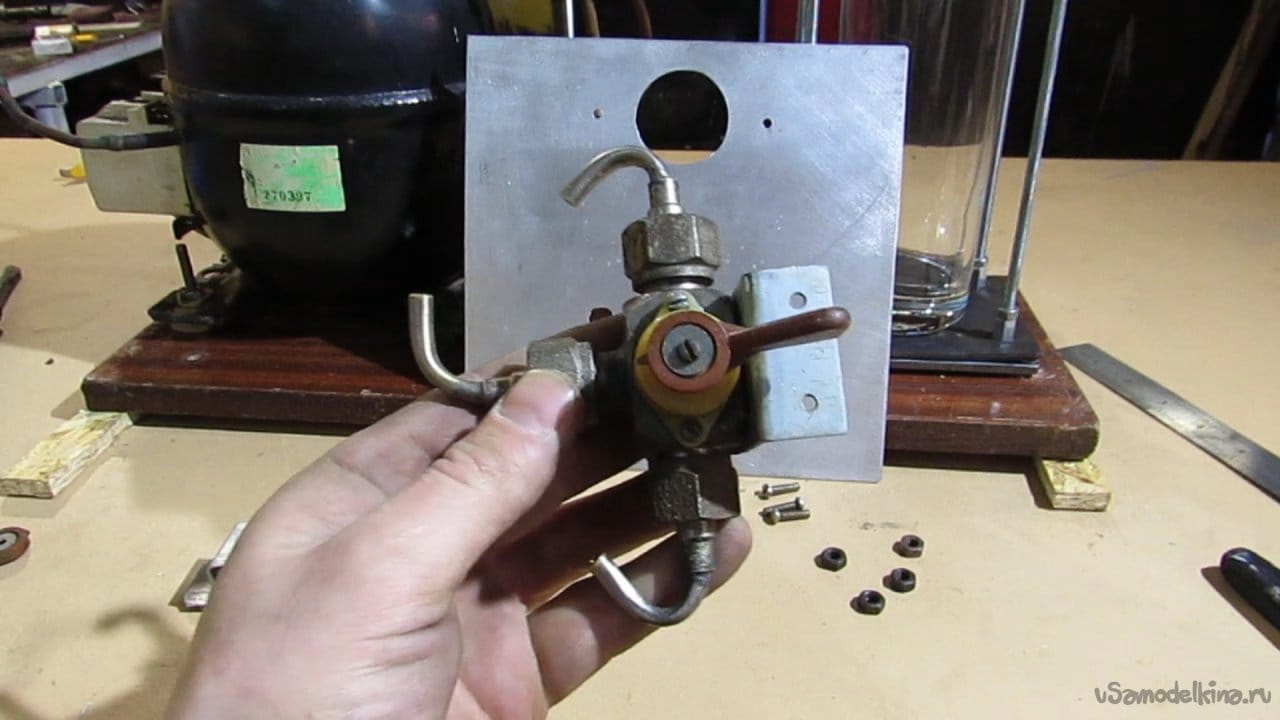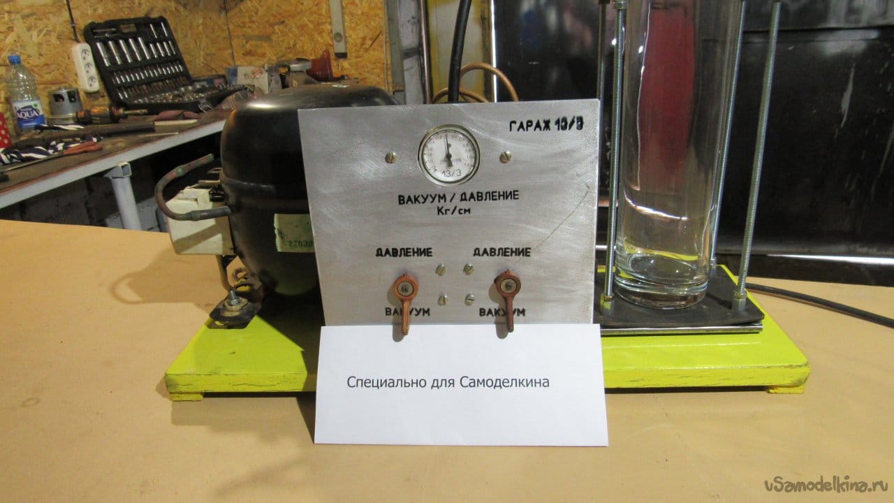 Жидкость и накопившийся конденсат смогут удаляться самостоятельно, если проделать отверстие в нижней стенке устройства. Отвод для газов делают при помощи клея и трубочки. Компрессор от холодильника представляет собою практически готовый вакуумный насос. Следующая инструкция подскажет, как сделать полноценную установку своими руками.
