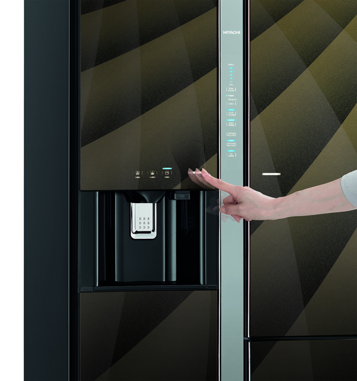 Для получения остуженной воды или льда, пользователю нужно лишь нажать клавишу на мониторе, который расположен на дверце холодильника и поставить стакан для наполнения в специальное отверстие.